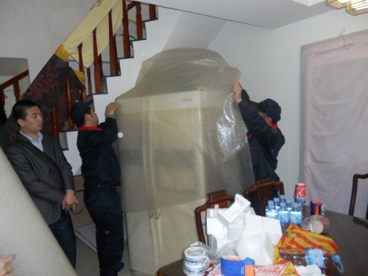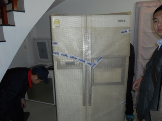 包装时,4、5个包装师傅,大家一来就很快的将带来的包装材料将家里的行李和家具分头包装。有的在房间包装柜子,有的在客厅包装电视柜和沙发。还有的厨房包装餐具,大家都各司其职,很快,一箱箱的物品都从家里搬到阳台上清点了。在这里主要给大家介绍一下在海龙国际搬家专家那学到的怎么保护打包冰箱防受损和搬运冰箱正确方法。