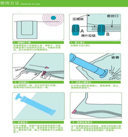 手动的抽气泵肯定没有电动的吸尘器来得快,但是只要正确使用也可以达到满意的效果。被子衣物装进去以后,首先要密封拉链。把真空压缩袋抽气阀上的防尘盖取掉,拧松阀门,尽力用手工压缩袋子争取多排掉一些空气。然后把气筒装在气阀上。如果气筒比较大,不好装进去的话,就取掉气筒前面的绿色的橡胶套,先将橡皮套装在压缩袋的气阀上,因为密封的原因,橡皮套会比气阀稍大,要用挤的方法装在气阀上。橡皮套装好以后再把气筒装在橡皮套上,这样就可以开始抽气了。