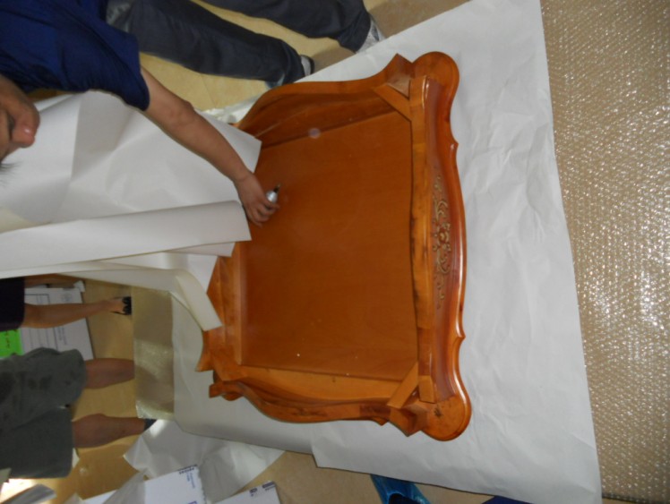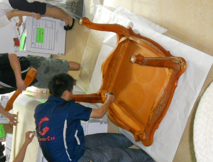 先用将四个桌角拆卸,用棉白纸包,再用气泡膜防震,最后装箱以防止损坏。